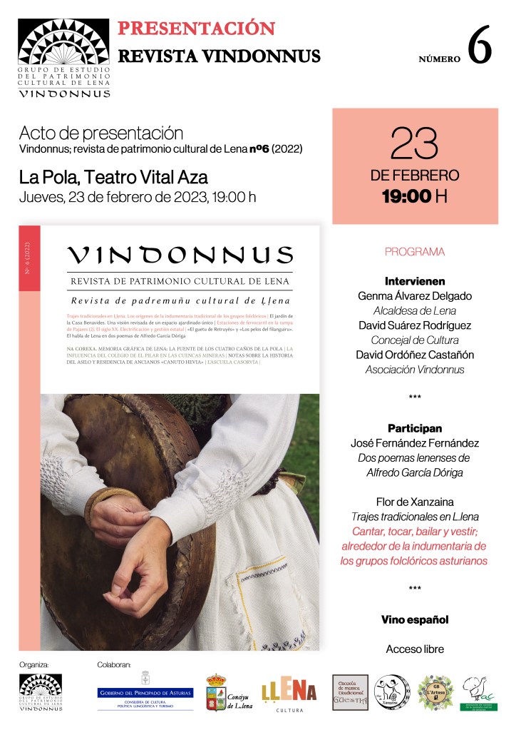 Nos complace anunciar el lanzamiento del último número (nº6/2022) de la Revista Vindonnus, de patrimonio cultural de Lena, cuya presentación se celebrará el jueves 23 de febrero, a las 19:00h, en el Teatro Vital Aza de La Pola.