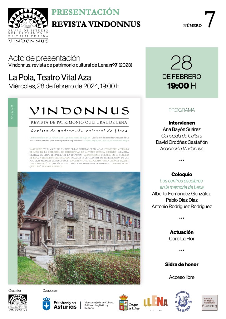 Nos complace anunciar el lanzamiento del último número (nº7/2023) de la Revista Vindonnus, de patrimonio cultural de Lena, cuya presentación se celebrará el miércoles 28 de febrero, a las 19:00h, en el Teatro Vital Aza de La Pola.